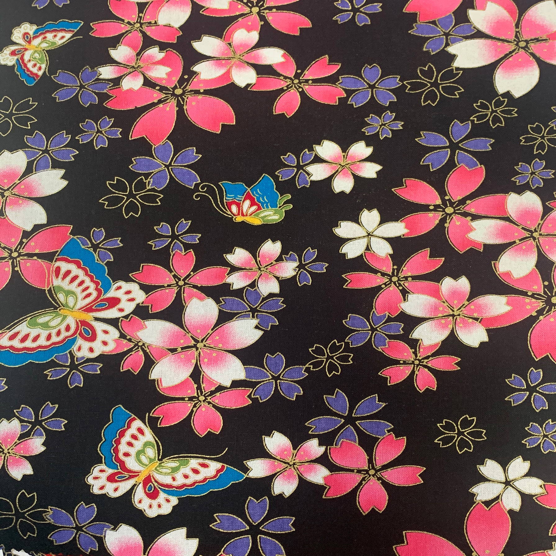 60″ Wide width printed cotton fabric with metallic print, featuring flowers and butterflies. Ideal for crafts, displays, table decoration and as a dress fabric.