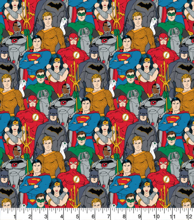A printed cotton fabric featuring DC super heroes. Ideal for use in crafting, as a dress fabric, for fancy dress costumes, for table cloths and also for use in displays.