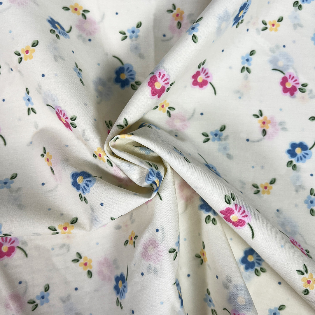 Dressmaking polycottons featuring dainty flowers in pastel colours.