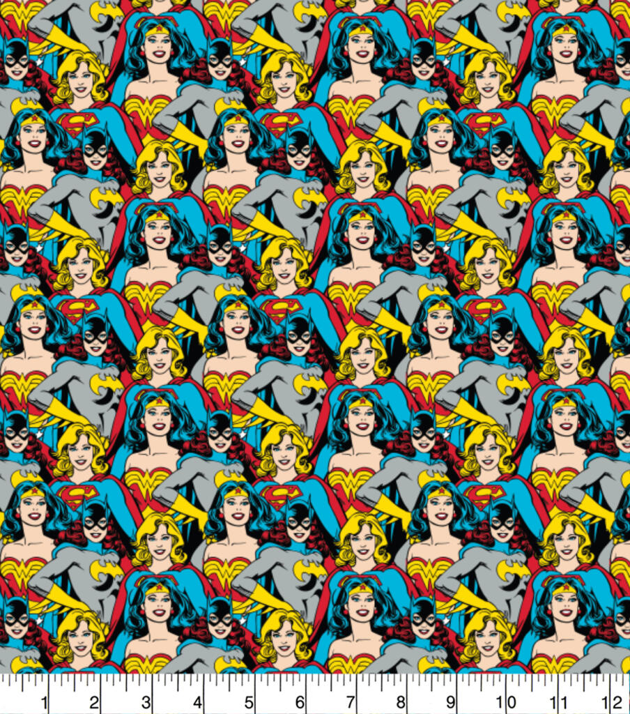 A printed cotton fabric featuring Wonder Woman. Ideal for use in crafting, as a dress fabric, for fancy dress costumes, for table cloths and also for use in displays.
