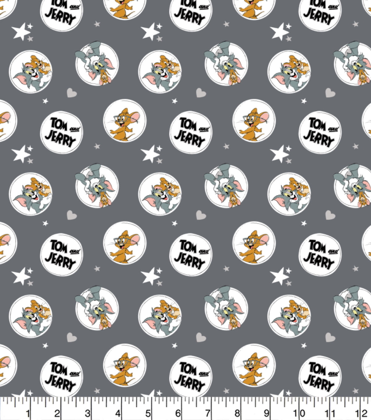 A printed cotton fabric featuring Tom & Jerry. Ideal for use in crafting, as a dress fabric, for fancy dress costumes, for table cloths and also for use in displays.